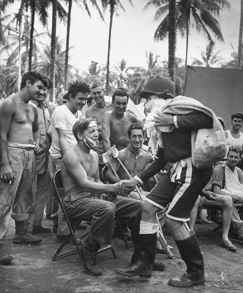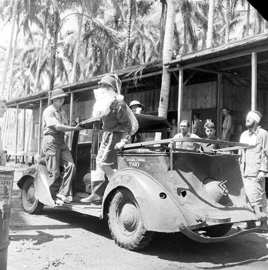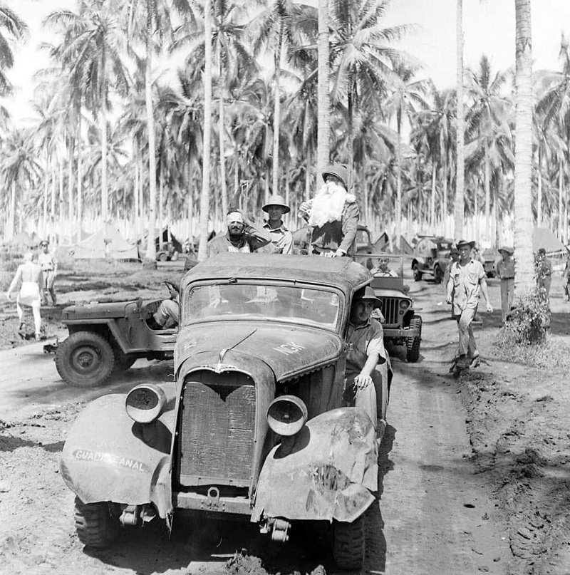 Once December 25 rolled around, Santa rolled up in his swanky new ride. Given the climate and what was happening, he traded in his red stocking cap for an M1 helmet and his trademark suit for shorts.