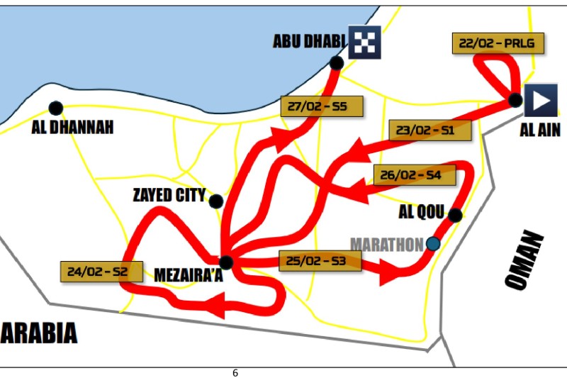 Al Ain’s Hazza bin Zayed Stadium will be as the site of the first bivouac. For the first time, there will be a second bivouac located in the Al Dhafra region by Mzeer’ah; this will serve as the main hub for most of the rally from that point on.