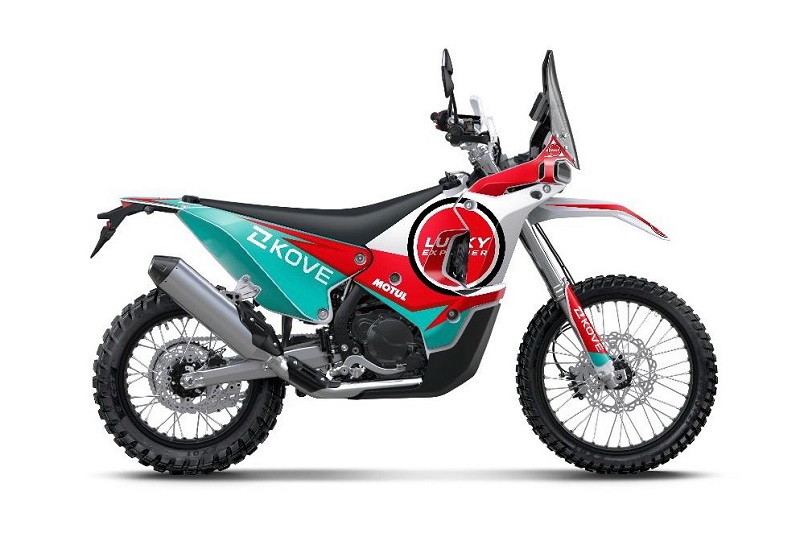 The Lucky Explorer edition features a special livery similar to what was on the Kove 450s of Ottavio Missoni Jr. and Cesare Zacchetti at the Dakar Rally. However, it has more teal than theirs and fewer stickers save for the large Lucky Explorer logo and Kove branding.